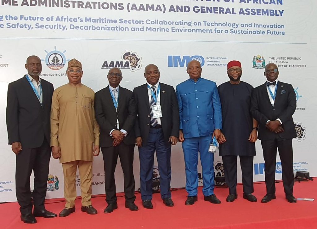 L-R: SA-DG (Administration and Operations) NIMASA, Olatunji Ahmed; Secretary General, Maritime Organisation of West and Central Africa (MOWCA) Paul Adalikwu; Director-General, Nigerian Maritime Administration and Safety Agency (NIMASA), Dr. Dayo Mobereola; Director Maritime Safety and Security, Federal Ministry of Marine and Blue Economy, Babatunde Bombata; Secretary General, Abuja MoU, Captain Sunday Umoren; Head, Africa Section, International Maritime Organisation (IMO) William Azu and Nigeria’s Alternate Permanent Representative at the IMO, William Bwala during the 7th Association of African Maritime Administrations (AAMA) conference in Dar es Salaam, Tanzania.